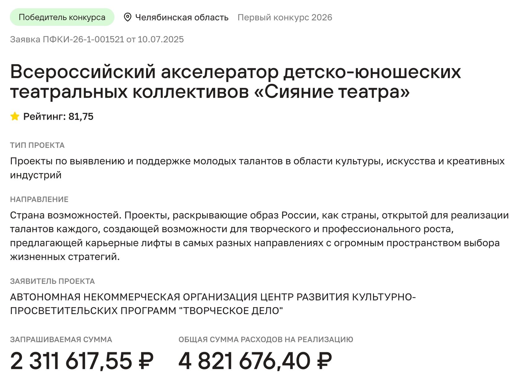 Сегодня объявили список проектов-победителей первого конкурса Президентского фонда культурных инициатив 2026 года. По итогам независимой экспертизы будет поддержано 810 проектов из 86 регионов России на общую сумму 4 млрд 796 млн рублей.